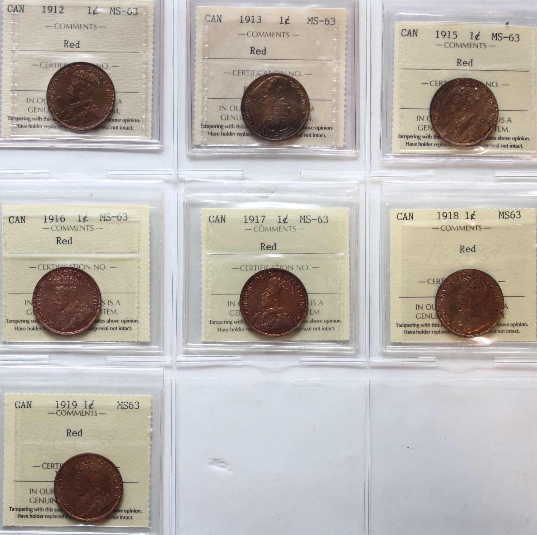 1912 1¢, 1913, 1915, 1916, 1917, 1918, 1919, All 7 coins ICCS Choice Mint State-63 Red.