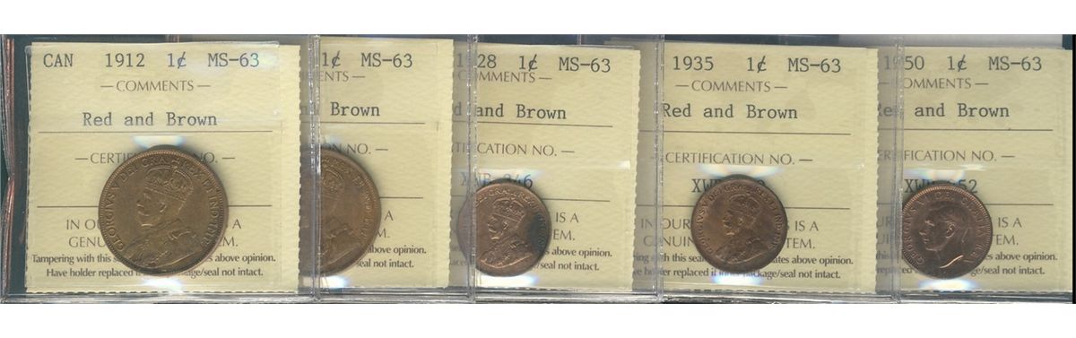 1912 1¢, 1918, 1928, 1935 & 1950 all ICCS MS63RB. Lot of 5 coins.