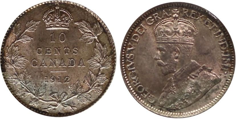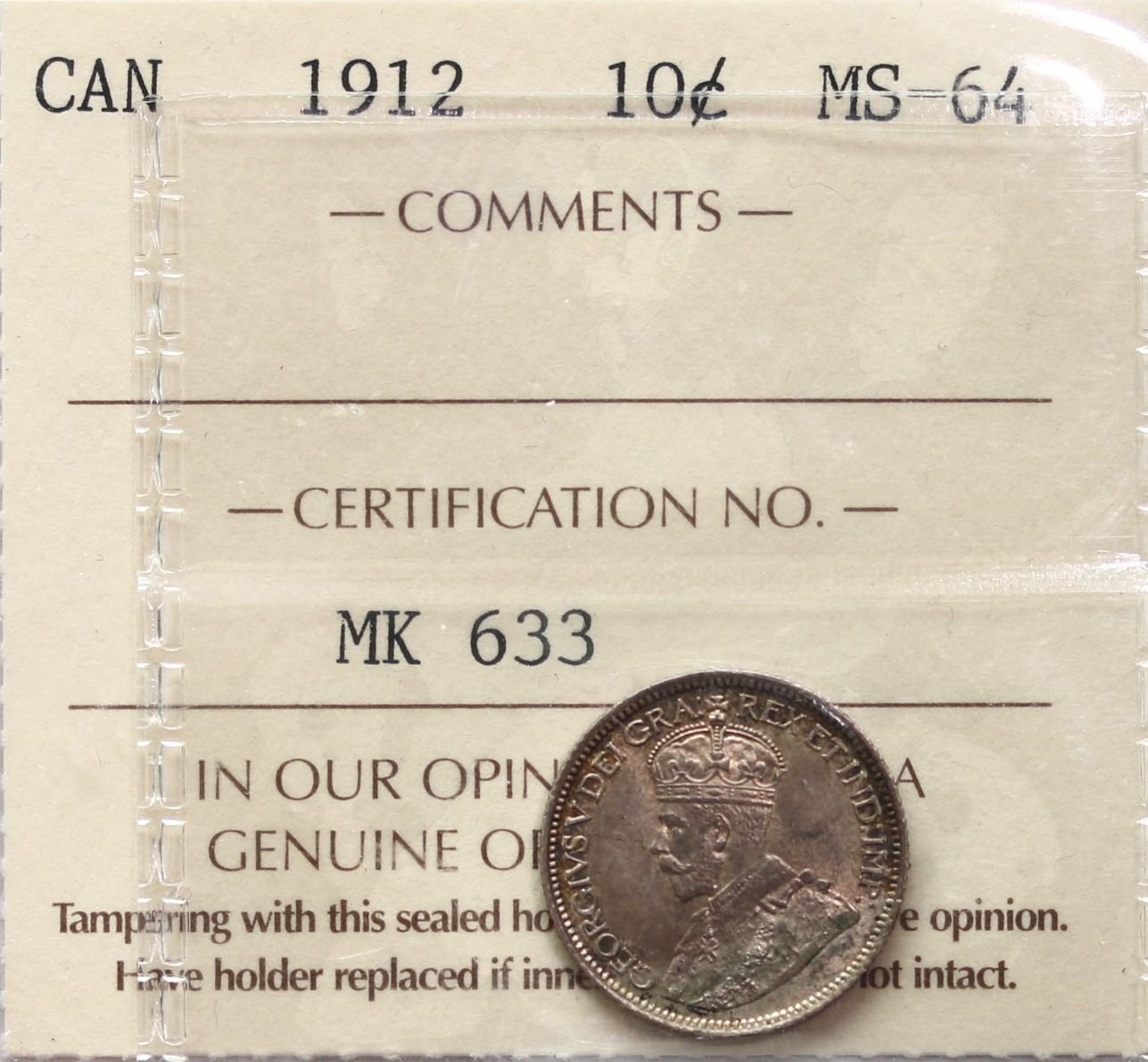 1912 10¢ ICCS Choice Mint State-64 Emerald, gold and russet tones over full underlying lustre.