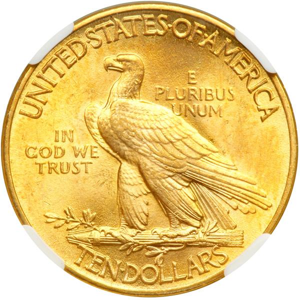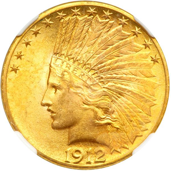 1912 $10 Indian. NGC graded MS-65. Rich golden toning. For those who aren't familiar with the growth of America's state-system, 1912 is the first year of issue in which the edge of the coin contains 48 raised stars. Previous issues had 46 stars on the edge. The additional stars are meant to honor the next two states in the U.S. at the time: Arizona and New Mexico. While 1912 is not a rare issue per se, it is scarce in Gem as the population figures indicate. This fine looking specimen has frosty luster with vivid honey-gold surfaces; no notable marks of any kind. Something for the collector with an eye for beauty! Pop 62; 17 finer (PCGS # 8871) .