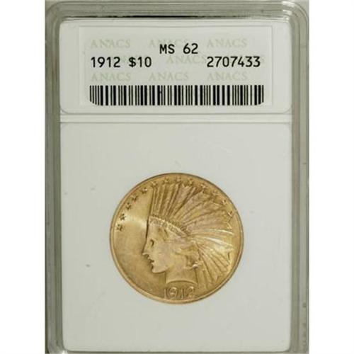 <B>1912 $10 MS62 ANACS.</B></I> NGC Census: (1372/784). PCGS Population (1099/709). Mintage: 405,083. Numismedia Wsl. Price for NGC/PCGS coin in MS62: $1,025. (#8871)<BR><BR><B>Coin Engraver:</B> Augustus Saint-Gaudens<BR><BR><b>Shipping:</b> Coins & Currency (<a target="_blank" href="http://www.heritageauctions.com/common/shipping.php">view shipping information</a>\)