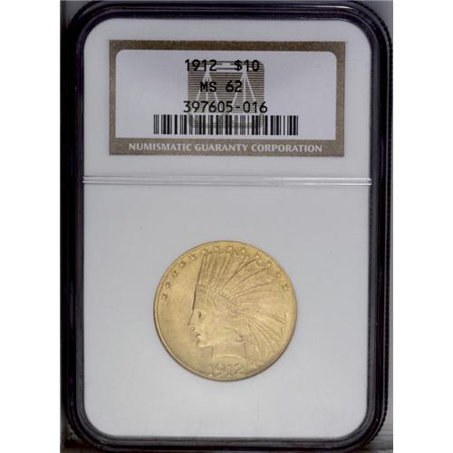 1912 $10 MS62 NGC. A highly lustrous yellow-orange pie