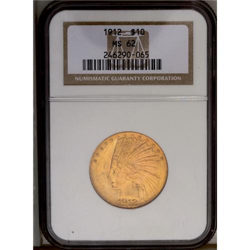 1912 $10 MS62 NGC. Hazel-green in the protected areas, 1912
