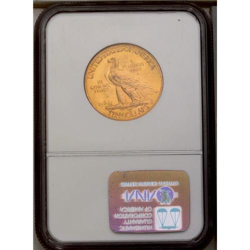 <B>1912<$10> MS62 NGC.</B></I> Hazel-green in the protected areas, with copper-orange dominating the devices. A few light scrapes and luster grazes on each side define the grade.