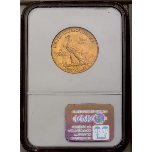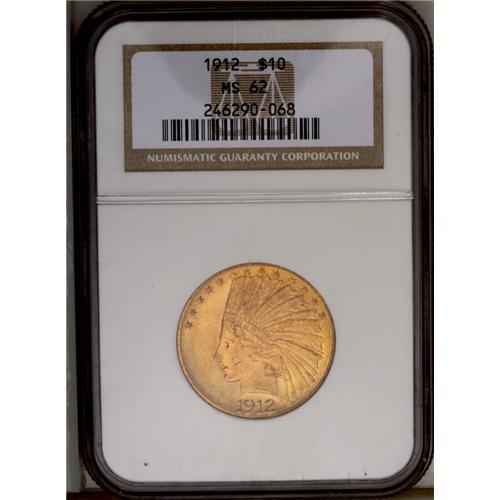 <B>1912<$10> MS62 NGC.</B></I> Lustrous medium golden-brown surfaces with tinges of green in the protected areas demonstrate a few abrasions in the prime focal areas that are consistent with the assigned grade.
