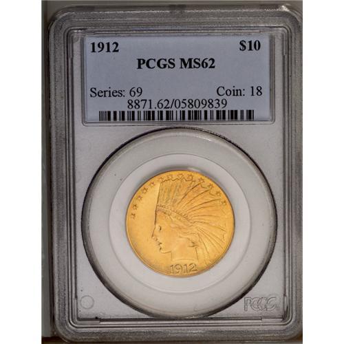 <B>1912<$10> MS62 PCGS.</B></I> This attractive peach-gold example shows grade-consistent abrasions, but the overall eye appeal is high, with brilliant luster and no particular distractions.