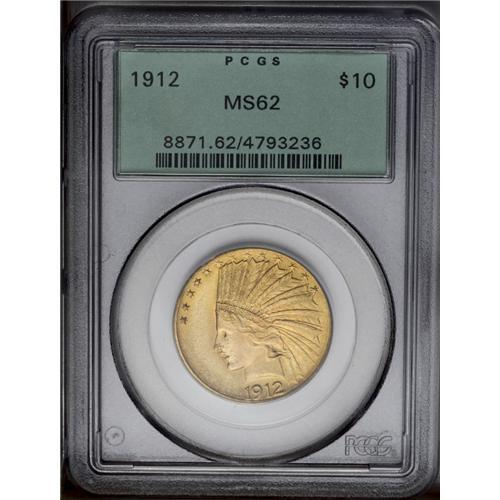 <B>1912<$10> MS62 PCGS.</B></I> Well struck with pale reddish highlights on the lustrous yellow-gold surfaces. A lightly abraded piece that is housed in a green label holder.<BR><I>From The Clifton Rodenburg Collection.</B></I>