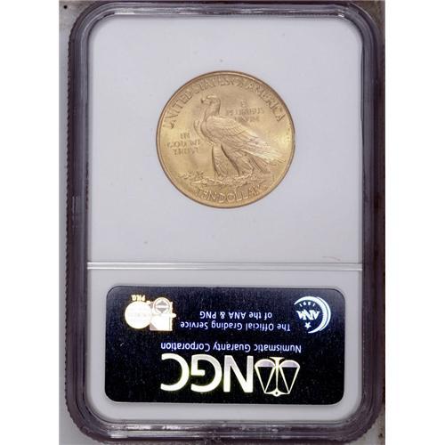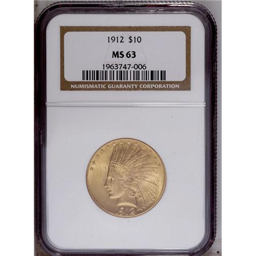 <B>1912<$10> MS63 NGC.</B></I> Boldly struck and fully lustrous with medium yellow-gold toning. A tiny aqua spot is concealed within the tail feathers.