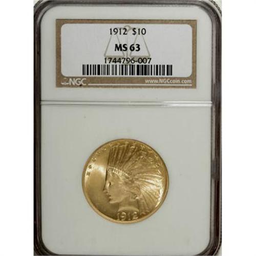 <B>1912 $10 MS63 NGC.</B></I> Both sides of this straw-gold Select eagle exhibit vibrant luster. Lightly abraded on the chin with excellent peripheral detail and a solidly struck eagle, though the hair over the ear displays a touch of softness.<BR><BR><B>Coin Engraver:</B> Augustus Saint-Gaudens<BR><BR><b>Shipping:</b> Coins & Currency (<a target="_blank" href="http://www.heritageauctions.com/common/shipping.php">view shipping information</a>)