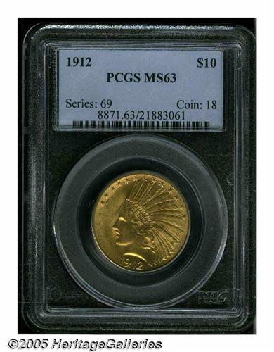 <B>1912<$10> MS63 PCGS.</B></I> Lustrous surfaces possess attractive greenish-gold color, and exhibit adequately struck design features. A few noticeable marks are visible on the Indian's face and on the eagle.