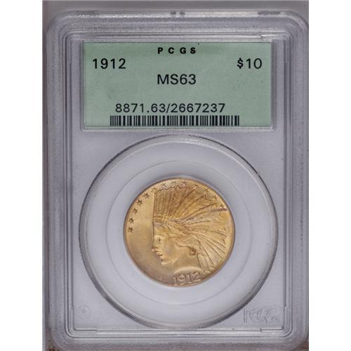 <B>1912 $10 MS63 PCGS.</B></I> Orange and lime colors endow this lustrous and pleasing example. Light marks are inconsequential aside from a thin dig near the U in UNITED. Certified in a green label holder.