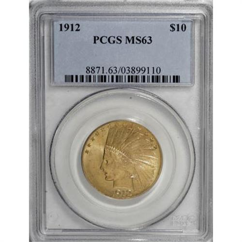 <B>1912 $10 MS63 PCGS.</B></I> This honey-gold representative has relatively few marks, and the cartwheel sheen is comprehensive. In 1912, the Denver Mint passed on the eagle denomination, the first such occurrence since its operations began in 1906.<BR><BR><b>Shipping:</b> Coins & Currency (<a target="_blank" href="http://www.heritageauctions.com/common/shipping.php">view shipping information</a>)