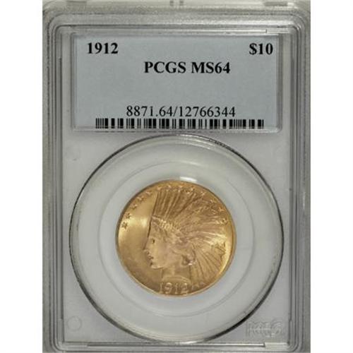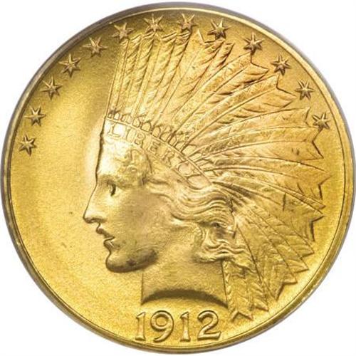 <B>1912 $10 MS64 PCGS.</B></I> This apricot-gold near-Gem ten dollar possesses rich, satiny luster and a bold strike. As noted in the Garrett-Guth reference, the 1912 eagle has two additional stars added to the rim to signify the addition of Arizona and New Mexico to the Union. As of (3/08), PCGS has graded only 31 pieces finer, <BR><BR><B>Coin Engraver:</B> Augustus Saint-Gaudens<BR><BR><b>Shipping:</b> Coins & Currency (<a target="_blank" href="http://www.heritageauctions.com/common/shipping.php">view shipping information</a>)