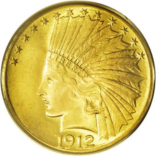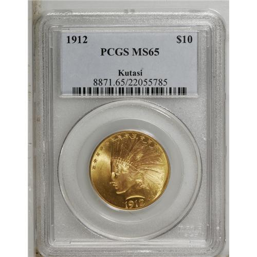 <B>1912<$10> MS65 PCGS.</B></I> Ex: Kutasi. A superlative Gem example with lovely orange-gold, green-gold, and apricot hues on both sides, complementing the swirling luster and thick mint frost. This coin appears to be on the cusp of an MS66 grade. Although one would never know it from the encapsulation, the 1912 eagles have two extra stars on the rim that signify the inclusion of New Mexico and Arizona into the Union in that year.