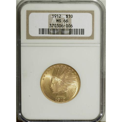<B>1912 $10 MS66 NGC.</B></I> Thick satin luster, almost matte in appearance, is immediately evident over the surfaces of this eagle, which boasts a considerable amount of attractive light rose color over its gold sheen. The strike is strong, with the exception of a bit of weakness on the highest point of the eagle's wing, as sometimes seen on this date. Surface marks are at a minimum, and the eye appeal is uncommonly high even for a coin in such a lofty grade as the present piece. Not a rare date in absolute terms by any means, yet quite rare as a Gem and obviously even more so in MS66. Only two pieces have been certified finer, one of which is the MS67 piece we offered in April 2006. This is a beautiful coin, likely destined to highlight an outstanding date or type set. Census: 18 in 66, 1 finer (11/06).<BR><BR><b>Shipping:</b> Coin/Currency (<a target="_blank" href="http://www.heritageauctions.com/common/shipping.php">view shipping information</a>)