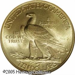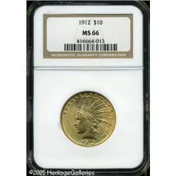 <B>1912 $10 MS66 NGC.</B></I> Very light yellow gold with hints of rose toning and frosty luster. This is a sharply struck example and a condition rarity. PCGS and NGC, combined, have only certified 21 examples of this date at the Premium Gem grade level, and each service has certified exactly one finer coin. Population: 15 in 66, 1 finer (1/05). Lot:8872