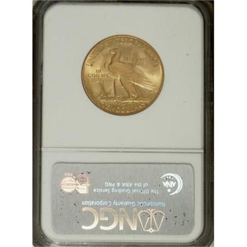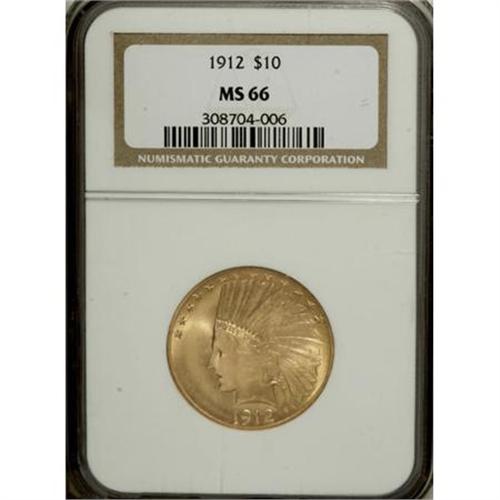 <B>1912 $10 MS66 NGC.</B></I> The 1912 ten dollar is one of the more available P-mints among Indian Head eagles, a popular and conditionally challenging series. This Premium Gem example shows exceptionally lustrous surfaces with rich orange-gold coloration. The surfaces are sharply defined throughout with no obvious or distracting abrasions. Interestingly, the edge of the 1912 eagles contains 48 stars instead of the previous 46 on those issues through 1911, because of the addition of New Mexico and Arizona to the Union as the 47th and 48th states. Census: 18 in 66, 1 finer (11/07).<BR><BR><B>Coin Engraver:</B> Augustus Saint-Gaudens<BR><BR><b>Shipping:</b> Coins & Currency (<a target="_blank" href="http://www.heritageauctions.com/common/shipping.php">view shipping information</a>)