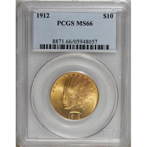 <B>1912 $10 MS66 PCGS.</B></I> The 1912 eagle, with a mintage of just over 400,000 pieces, has a reputation as one of the more available issues in the Saint-Gaudens series. While not present in such quantities as the 1926 or 1932, Garrett and Guth (2006) state that enough "were coined and saved to satisfy collector demand." While this holds true even for Gems, anything finer is a condition rarity.<BR> The surfaces of this immensely appealing Premium Gem are yellow-orange with a touch of peach at the upper right obverse. Aside from a touch of softness at the hair below the headband, the minimally marked devices have strong detail, and the glowing fields have a slightly satiny appearance. One of just nine pieces so graded by PCGS, with just two finer across both major services (5/07).<BR><BR><b>Shipping:</b> Coins & Currency (<a target="_blank" href="http://www.heritageauctions.com/common/shipping.php">view shipping information</a>)