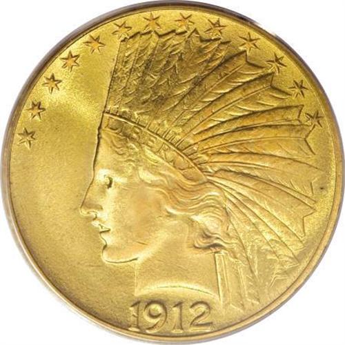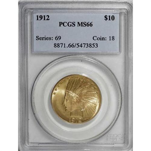 <B>1912 $10 MS66 PCGS.</B></I> On January 6, 1912, New Mexico joined the Union as the 47th state. Arizona followed on February 14 as the 48th, and the Mint increased the number of rim stars on the Indian Head eagle from 46 to 48 to commemorate the new Western states, making the 1912 and later coins technically a subtype within the series.<BR> The 1912, along with several other P-mint issues in the teens, is a well-produced and available type coin even in high Mint State grades, although its population figures in MS66 and MS67 are consistently a tad lower than the 1910, 1911, and 1913 pieces. PCGS has certified nine examples of the 1912 in MS66, while NGC has graded 18 MS66s, and there is one finer at each service (5/07). This example offers lush, medium golden-yellow surfaces with deeper peach-gold on the highpoints. The radiant cartwheel luster equals that of many a flashy Morgan dollar, and singular distractions are expectedly absent. A Premium Gem for a premium type set.<BR><I>From The Belle Glade Collection, Part Two.</B></I><BR><BR><B>Coin Engraver:</B> Augustus Saint-Gaudens<BR><BR><b>Shipping:</b> Coins & Currency (<a target="_blank" href="http://www.heritageauctions.com/common/shipping.php">view shipping information</a>\)