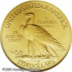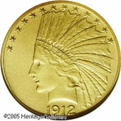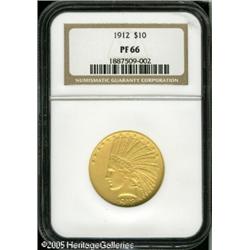 <B>1912 $10 PR66 NGC.</B></I> Only 83 proof Ten Indians were struck, and the 1912 stands as the premier rarity among the eight years of matte proofs that were struck, 1908 to 1916. David Akers (1980) perhaps summed up the importance of this issue best when he wrote: "Proofs of this date are extremely rare, and in my opinion, are the rarest of the Indian Head type. The mintage would not indicate this but either the proofs of this year suffered an unusually high attrition rate for some reason, or most of the mintage were melted because the 1912 appears less often in proof than any other Indian Head. I doubt if more than 15-20 can be accounted for today, and only one has appeared at auction in over 25 years." We believe the number of survivors to be somewhat higher, but still a very modest 20-25 pieces.<BR> Struck with the fine sandblast finish of the 1908 and 1911-15 proofs, this piece is somewhat deep in color with some mustard patina overall. Under magnification the matte finish shows innumerable sparkling facets from the random dispersal of light across the sandblast surfaces. As one would expect from a coin of this grade, there are no mentionable contact marks. The only ripple in the fabric of this lovely proof that could serve as an identifier for future pedigree purposes is a small pinpoint planchet imperfection at 3 o'clock near the reverse rim. With so few coins known today, it is not too surprising that this piece is one of the finest known. Obviously, a very rare and important offering of this key date matte proof Ten. Population: 5 in 66, 4 finer (1/05). Lot:8912