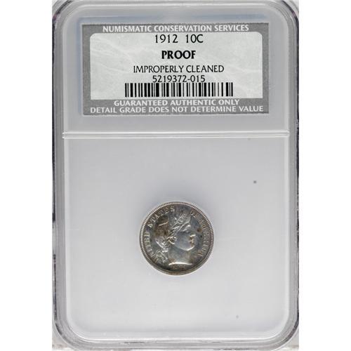 <B>1912 10C --Improperly Cleaned--NCS. Proof.</B></I> NGC Census: (0/0). PCGS Population (0/0). Mintage: 700. (#4896)<BR><BR><b>Shipping:</b> Coins & Currency (<a target="_blank" href="http://www.heritageauctions.com/common/shipping.php">view shipping information</a>)