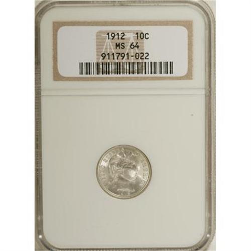 <B>1912 10C MS64 NGC.</B></I> NGC Census: (222/156). PCGS Population (187/158). Mintage: 19,350,000. Numismedia Wsl. Price for NGC/PCGS coin in MS64: $252. (#4860)<BR><BR><b>Shipping:</b> Coins & Currency (<a target="_blank" href="http://www.heritageauctions.com/common/shipping.php">view shipping information</a>)