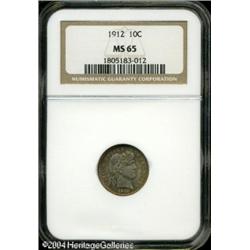 1912 10C MS65 NGC. Well struck with satiny luster <B>1912 10C MS65 NGC.</B></I> Well struck with satiny luster and pleasing variegated colors near the peripheries of each side. In terms of surface preservation, this lovely Gem is nearly pristine. <BR><BR><B>Important notice:</B> Heritage usually auctions material at the rate of 200-250 lots per hour. On some occasions eBay Live bid software or the Internet may not be able to keep up with the pace of the auction. We recommend placing a realistic absentee bid now as insurance to avoid disappointment. Occasionally the auctioneer may eliminate or reject an eBay Live bid, and the auctioneer may also reopen a lot after the close of the eBay live bidding (usually because we missed an audience bid), and may reject your bid even if it shows you as the winning bidder. By bidding via eBay Live, you agree that Heritage may award the lot to another bidder at its sole discretion under the circumstances described above or any other reasonable circumstances. Since eBay bids are not shown to us until we open the lot on the floor, we treat those bids just like floor bids. In most cases the floor responds before the eBay bid is presented to us, due to Internet lag time, so for consistency we have made it a policy that floor bids are always considered first over tie eBay live bids. Also please note that all Heritage lots purchased through eBay Live carry a 20% Buyer's Premium. Please make sure you read the Terms and Conditions before you bid. This lot is being auctioned in conjunction with a live floor auction by Heritage Galleries & Auctioneers. All final auction and invoice information will be supplied by Heritage Galleries & Auctioneers, and all other information should be considered preliminary. Lot:5779