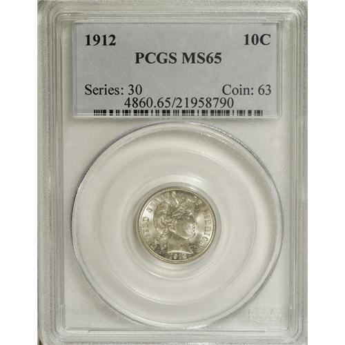 <B>1912 10C MS65 PCGS.</B></I> PCGS Population (113/45). NGC Census: (122/34). Mintage: 19,350,000. Numismedia Wsl. Price: $550. (#4860)<BR><BR><b>Shipping:</b> Coins & Currency (<a target="_blank" href="http://www.heritageauctions.com/common/shipping.php">view shipping information</a>)