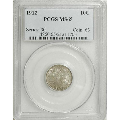 <B>1912 10C MS65 PCGS.</B></I> PCGS Population (113/45). NGC Census: (122/34). Mintage: 19,350,000. Numismedia Wsl. Price: $550. (#4860)<BR><BR><b>Shipping:</b> Coins & Currency (<a target="_blank" href="http://www.heritageauctions.com/common/shipping.php">view shipping information</a>)
