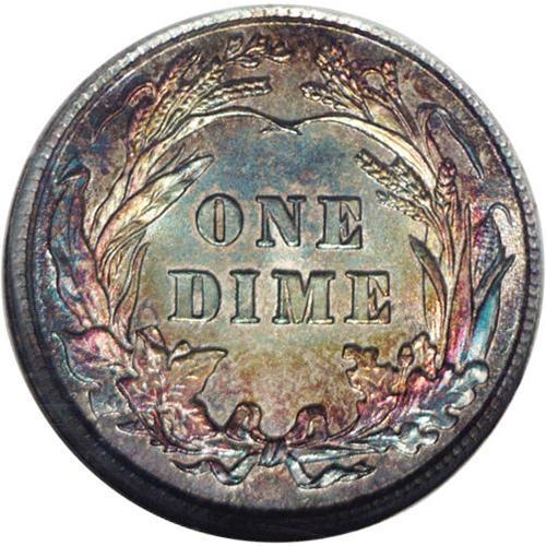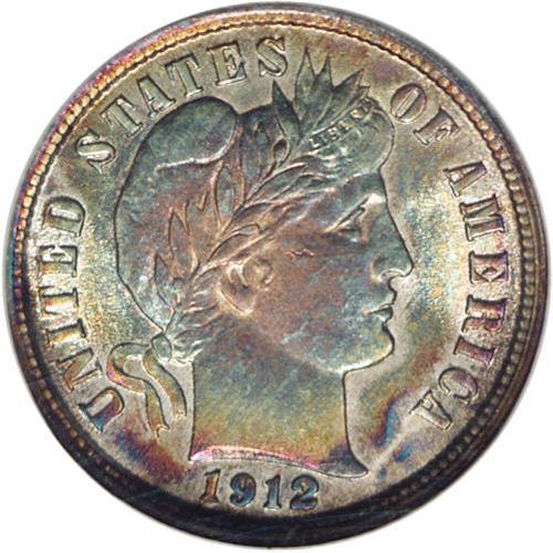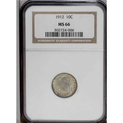 <B>1912<10C> MS66 NGC.</B></I> Lavish apple-green, honey, and ruby-red patination endows this lustrous and crisply struck Premium Gem. The fields are gorgeously unabraded. Like other 20th century Philadelphia issues, the 1912 is plentiful in circulated grades and available in Mint State. However, the issue becomes difficult to find at the MS66 level. Census: 26 in 66, 7 finer (2/06).