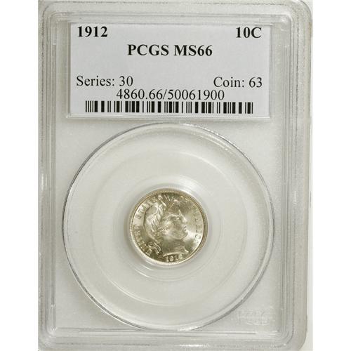 <B>1912 10C MS66 PCGS.</B></I> The later Philadelphia Barber dime issues have generous mintages that make them appealing to type collectors, though grades beyond Gem remain difficult to find. This slightly satiny gold-kissed example displays pleasing luster and solid definition overall, a combination that creates winning eye appeal. PCGS has certified just four Superb Gems (4/07).<BR><BR><b>Shipping:</b> Coins & Currency (<a target="_blank" href="http://www.heritageauctions.com/common/shipping.php">view shipping information</a>)
