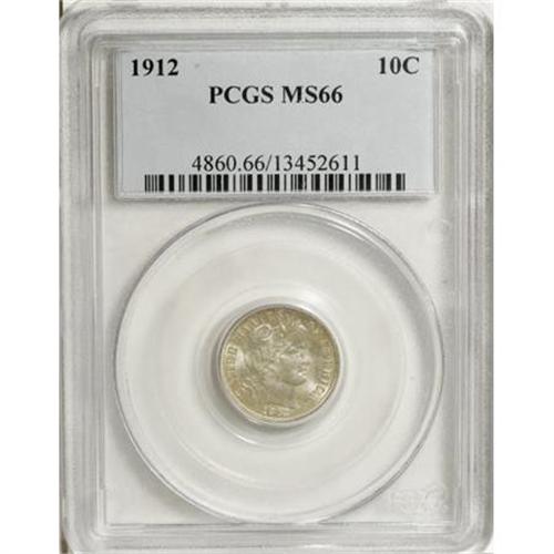 <B>1912 10C MS66 PCGS.</B></I> Delicate gold and tan accents grace the margins of this frosty Premium Gem, while the centers are largely untoned. A pleasingly delineated and attractive example of this later Barber dime issue. Population: 42 in 66, 4 finer (8/07). <BR><BR><B>Coin Engraver:</B> Charles E. Barber<BR><BR><b>Shipping:</b> Coins & Currency (<a target="_blank" href="http://www.heritageauctions.com/common/shipping.php">view shipping information</a>)