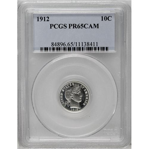 <B>1912<10C> PR65 Cameo PCGS.</B></I> Nearly untoned surfaces display just the slightest whisper of occasional light gold color, which is complemented by great motif-field contrast and a razor-sharp strike. A stray faint slide mark or two on Liberty's cheek precludes an even higher grade. Population: 6 in 65, 5 finer (4/06).
