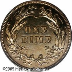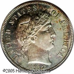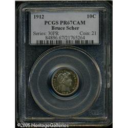 <B>1912 10C PR67 Cameo PCGS.</B></I> Spectacularly toned in aquamarine and rose-gold colors on the obverse, while the reverse provides equally vivid honey patina. A faint hairline or two beneath the M in DIME, however, the preservation is generally outstanding. This is confirmed by its status as the single finest PCGS certified proof 1912 Dime. No Deep Cameo examples have been encapsulated by either major service. Only 700 pieces were struck. Population: 1 in 67, none finer (1/05).<BR><I>From the Bruce Scher #1 All-Time PCGS Registry Set.</B></I> Lot:4072