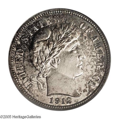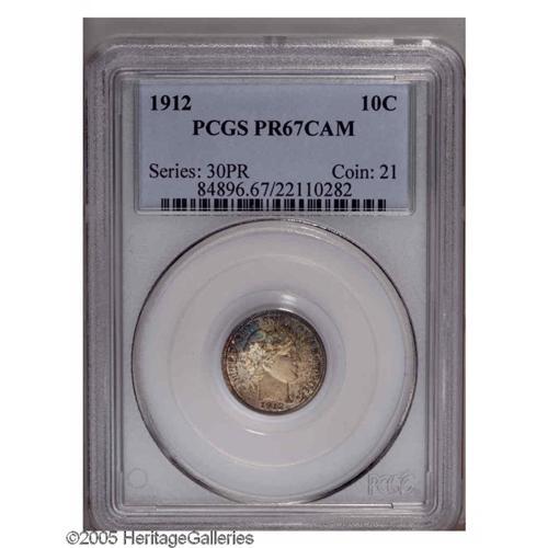 <B>1912<10C> PR67 Cameo PCGS.</B></I> Spectacularly toned in aquamarine and rose-gold colors on the obverse, while the reverse provides equally vivid honey patina. The design features are exquisitely struck, further generating outstanding eye appeal. A faint hairline or two is noted beneath the M in DIME, however, the preservation is generally outstanding. This is confirmed by its status as one of the two finest PCGS-certified cameo proof 1912 Dimes (11/05). Only 700 pieces were struck.