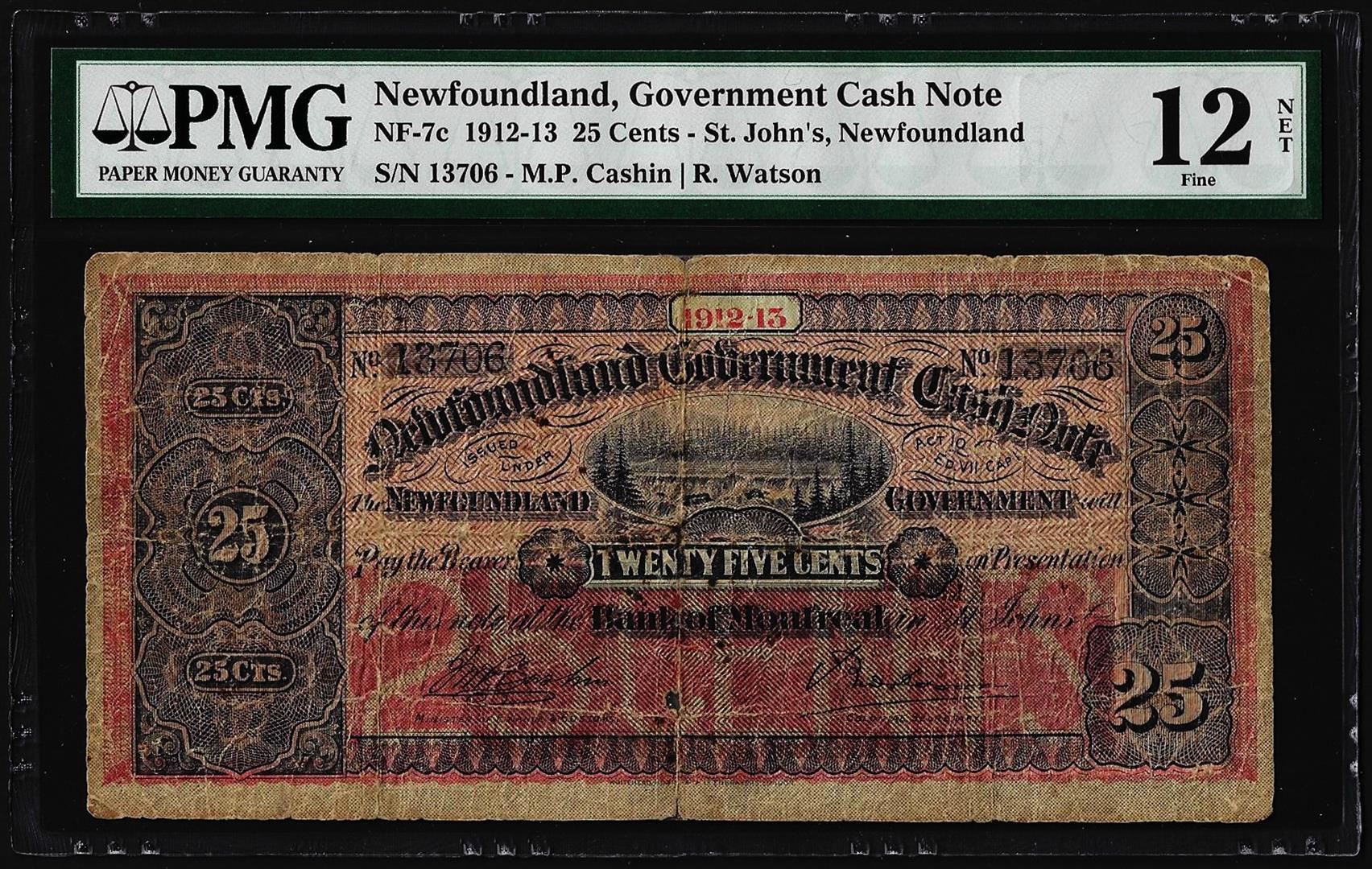 One 1912-13 Newfoundland 25 Cents Government Cash Note NF-7c PMG Fine 12 Net. PMG Certified.