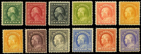 **/* 1912-14, 1¢-50¢ Washington-Franklins Complete. Including extra 10¢. O.g., 407 and 418 never hinged, others hinged (some sweated). A fresh and generally well centered group. Fine to Very Fine.