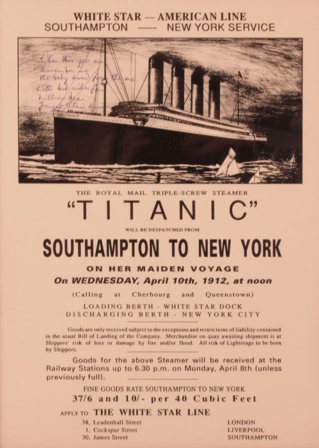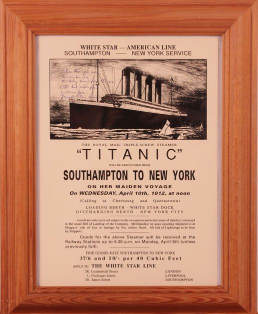 A print of an advertisement for the Titanic's maiden voyage with the signature of Millvina Dean and a verse in her hand, "When this you see, remember me, the baby saved from the sea.." Framed. Also with a reproduction Carpathia medal.
