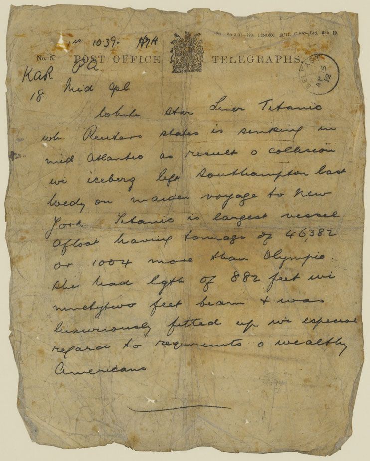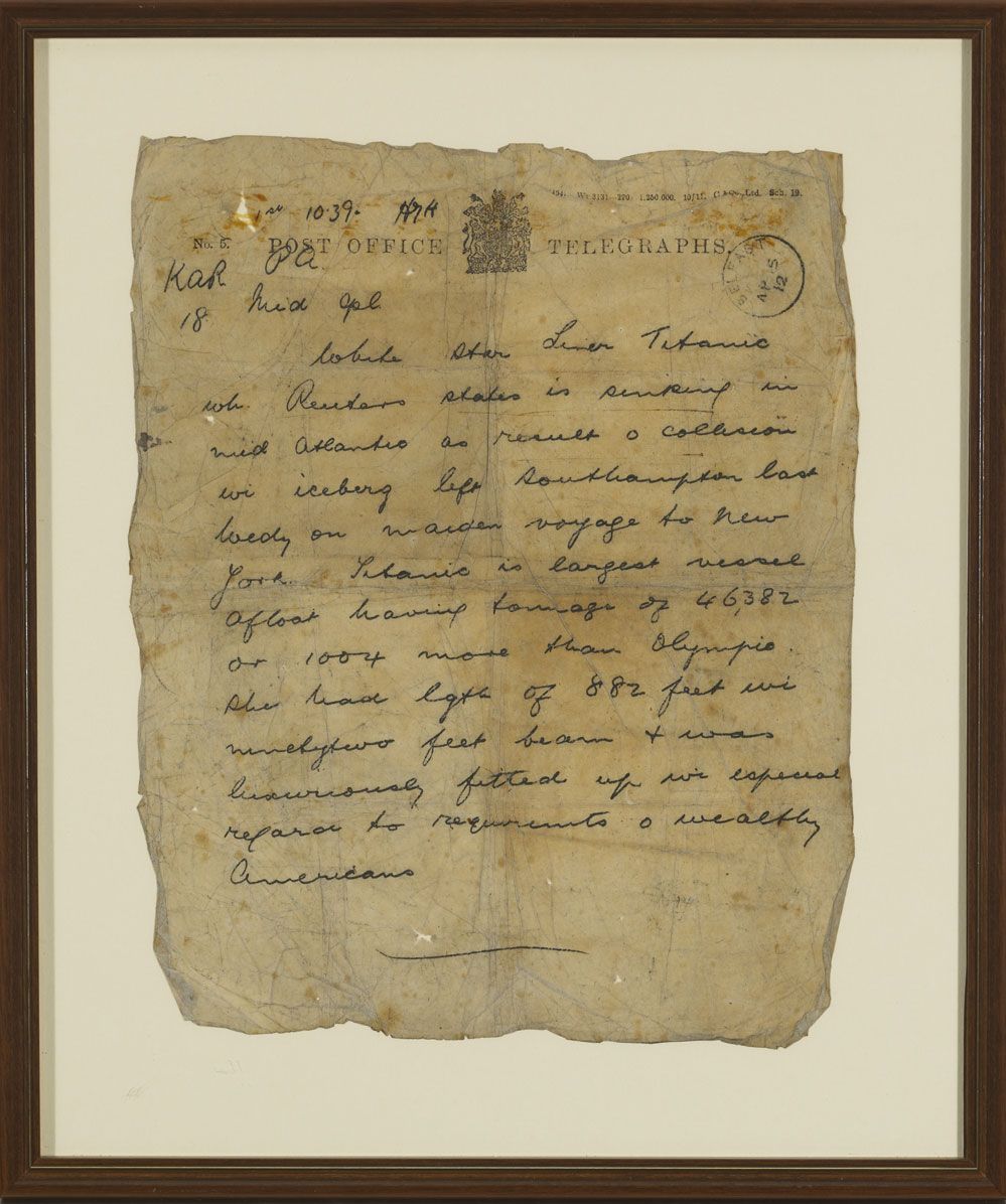Manuscript on 'Post Office Telegraphs' headed paper, with date and receiving office stamp "Belfast Apr 15. 12" stating"White Star Liner Titanic wh. Reuters states is sinking in mid Atlantic as result of collision wi iceberg left Southampton last Wedy. on maiden voyage to New York. Titanic is largest vessel afloat having tonnage of 46,382 or 1004 more than Olympic. She has lgth of 882 feet wi ninety two feet breadth & was luxuriously fitted up wi especial regard to requirements o wealthy Americans"This unique and historically important telegram was sent by the Press Association (as indicated by "P.A." in ms at top of the form) to the Belfast Evening Telegraph and received by journalist Robert (Bob) McComb. The date stamp bears the date of 15 April 1912, the day on which the Titanic sank in the North Atlantic Ocean, and the time is written as 10.39 (presumably morning, and as receipt in Belfast), about three hours after the ship had sunk) making this document the first notification of the ship's sinking and allowing the newspaper to be one of the first to break the news of the Titanic.It is difficult to comprehend the disbelief and shock which must have greeted this telegram as it arrived at the offices of the Telegraph, the largest selling newspaper in Titanic's home city of Belfast. The news which the telegram gives reflects the fragmented and sparse nature of the initial information which filtered back to Ireland relating to the fate of the world's most famous ship. This telegram allowed the Telegraph to achieve the amazing feat of breaking the Titanic news on the same day as the sinking. Their dramatic headline was paraphrased from the content of the telegram and read "The Titanic Sinking ". The desperation for more information would have clearly permeated throughout the offices of the newspaper and Bob McComb was gifted this important document as a reminder of one of the most shocking moments, not only in his career, but also in the history of Belfast.McComb was one of the Telegraph's most celebrated and legendary journalists. He began working for the newspaper while it was under the management of Sir Robert Baird and was aged 41 and working as sub-editor in 1912. He served a total of 34 years on the staff of the Telegraph and was later described as having "covered some of the biggest news stories of his time, his resourcefulness when on an assignment was almost legendary". There would be few stories 'bigger' than that of Titanic.Bob McComb died in May 1932 but his preservation of this historically important document insured its survival over the passing of 100 years, which is remarkable given its fragility. It serves as a tangible link between the events of a century ago and a city which spent three years creating the world's most famous ship, only to receive this telegram and news of its demise, with terrible loss of life, two weeks after seeing it leave.