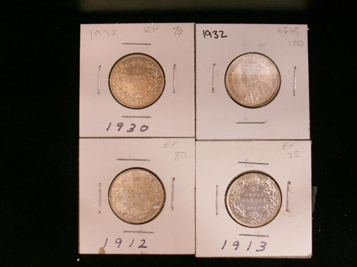 1912, 1913, 1930 & 1932 25¢ EF40. Lot of 4 coins all white and all EF in grade.