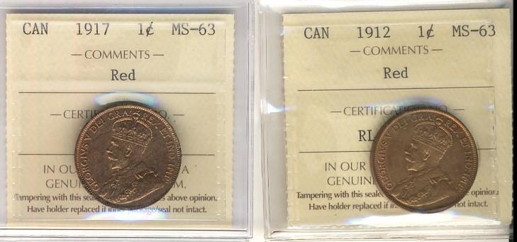 1912 & 1917 1¢ ICCS MS63RD. Lot of 2 coins.