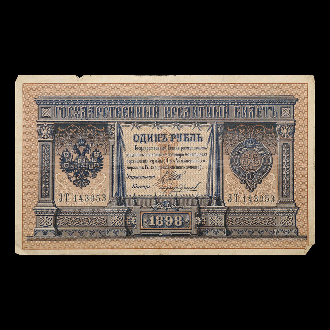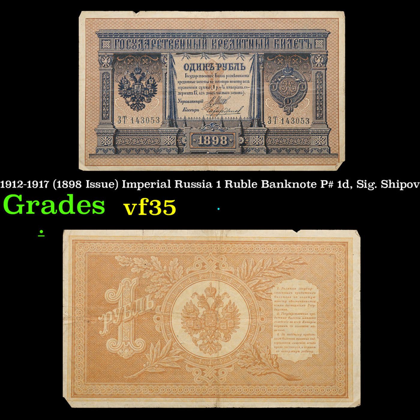 1912-1917 (1898 Issue) Imperial Russia 1 Ruble Banknote P# 1d, Sig. Shipov Grades vf++. Up for auction we have a beautiful, ornate Imperial Ruble note from the final decade of the Russian Empire under Tsar Nicholas II, which managed to survive through the Russian Revolution and Civil War. These notes became relatively useless in the early Soviet period, due to hyperinflation and other factors, and many were lost or destroyed.