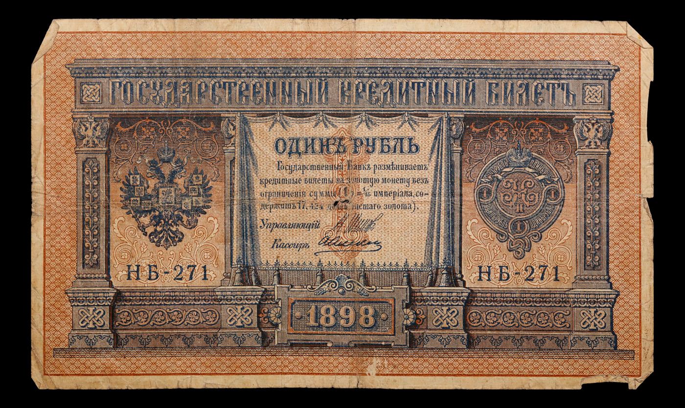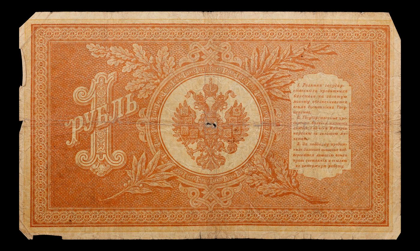 1912-1917 (1898 Issue) Imperial Russia 1 Ruble Banknote P# 1d, Sig. Shipov Grades vf+. Up for auction we have a beautiful, ornate Imperial Ruble note from the final decade of the Russian Empire under Tsar Nicholas II, which managed to survive through the Russian Revolution and Civil War. These notes became relatively useless in the early Soviet period, due to hyperinflation and other factors, and many were lost or destroyed. The 500 Ruble note features a portrait of Peter the Great, and the 100 Ruble note features a portrait of Catherine the Great.