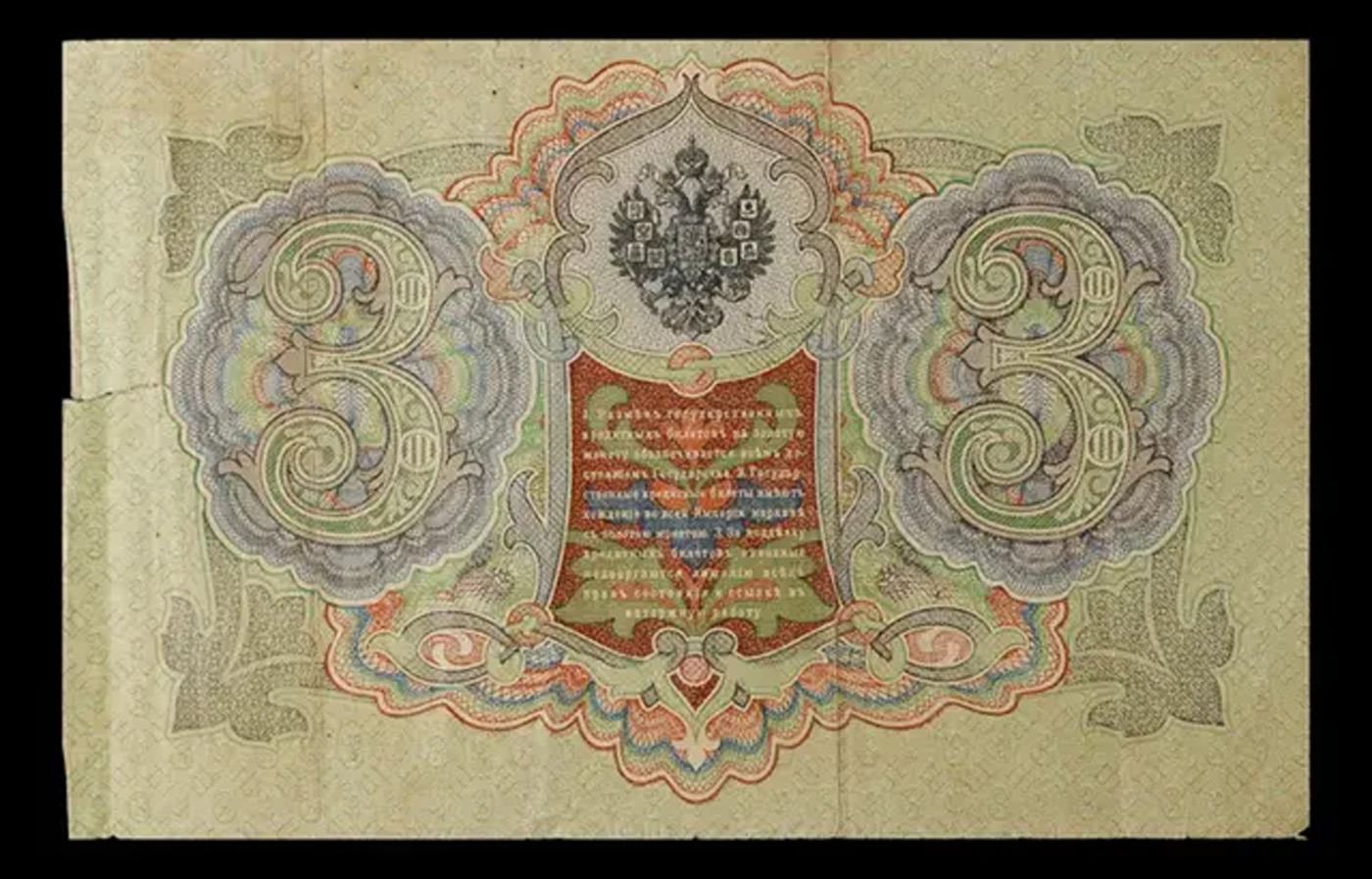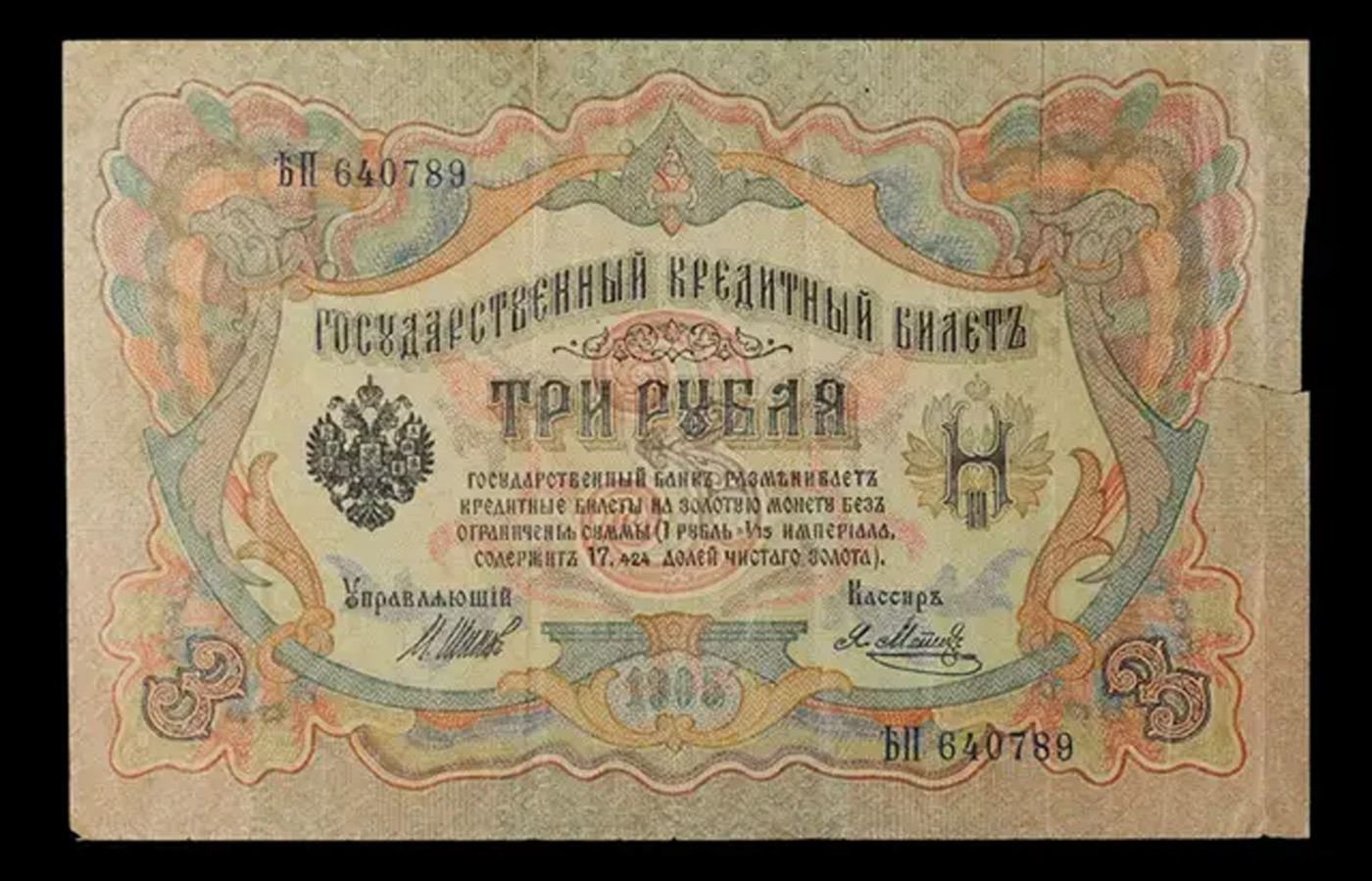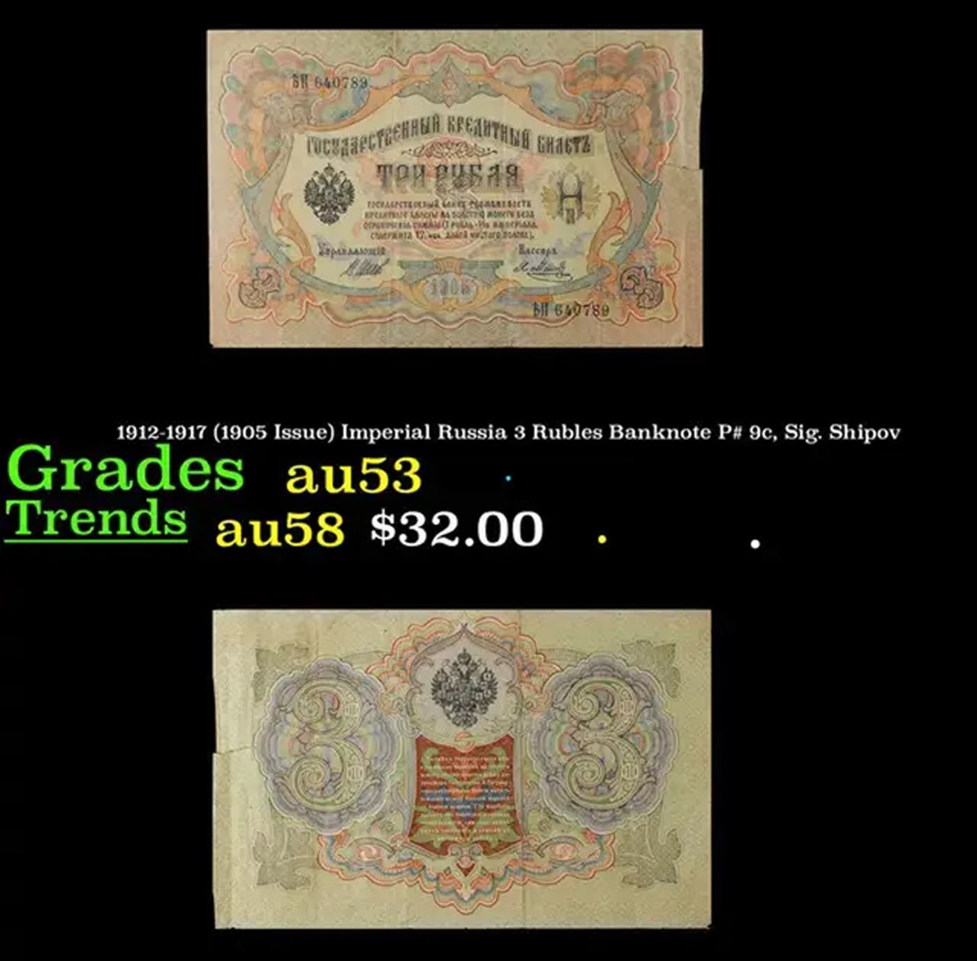 1912-1917 (1905 Issue) Imperial Russia 3 Rubles Banknote P# 9c, Sig. Shipov Grades Select AU. Up for auction we have a beautiful, ornate Imperial Ruble note from the final decade of the Russian Empire under Tsar Nicholas II, which managed to survive through the Russian Revolution and Civil War. These notes became relatively useless in the early Soviet period, due to hyperinflation and other factors, and many were lost or destroyed. The 500 Ruble note features a portrait of Peter the Great, and the 100 Ruble note features a portrait of Catherine the Great.
