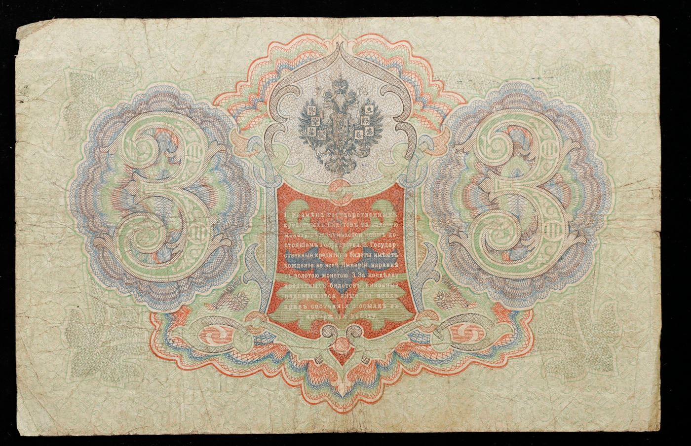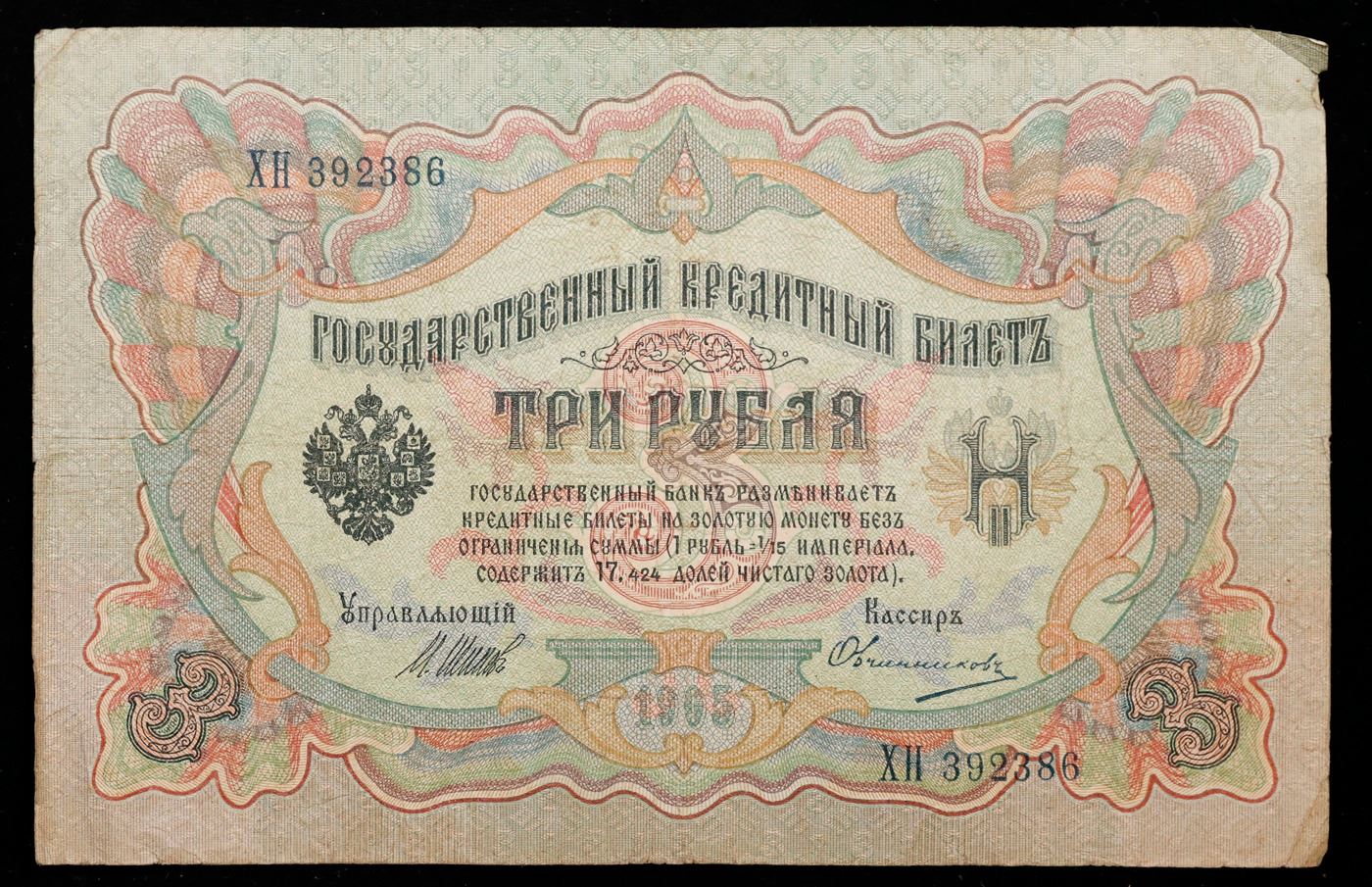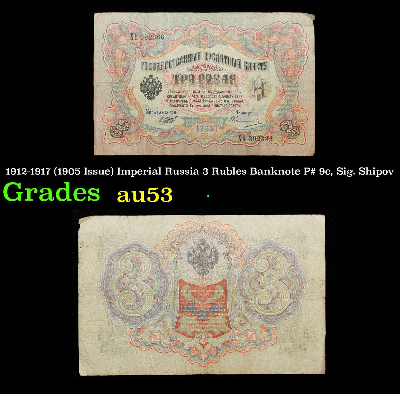 1912-1917 (1905 Issue) Imperial Russia 3 Rubles Banknote P# 9c, Sig. Shipov Grades Select AU. Up for auction we have a beautiful, ornate Imperial Ruble note from the final decade of the Russian Empire under Tsar Nicholas II, which managed to survive through the Russian Revolution and Civil War. These notes became relatively useless in the early Soviet period, due to hyperinflation and other factors, and many were lost or destroyed. The 500 Ruble note features a portrait of Peter the Great, and the 100 Ruble note features a portrait of Catherine the Great.