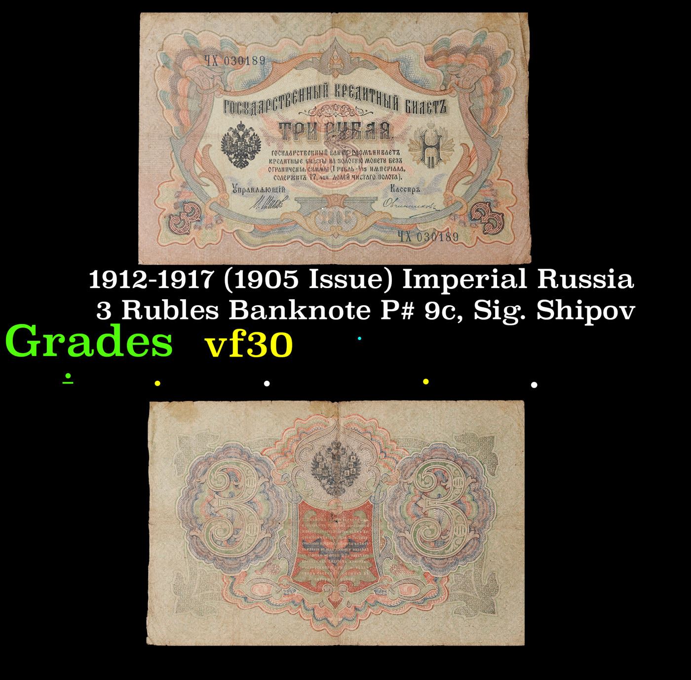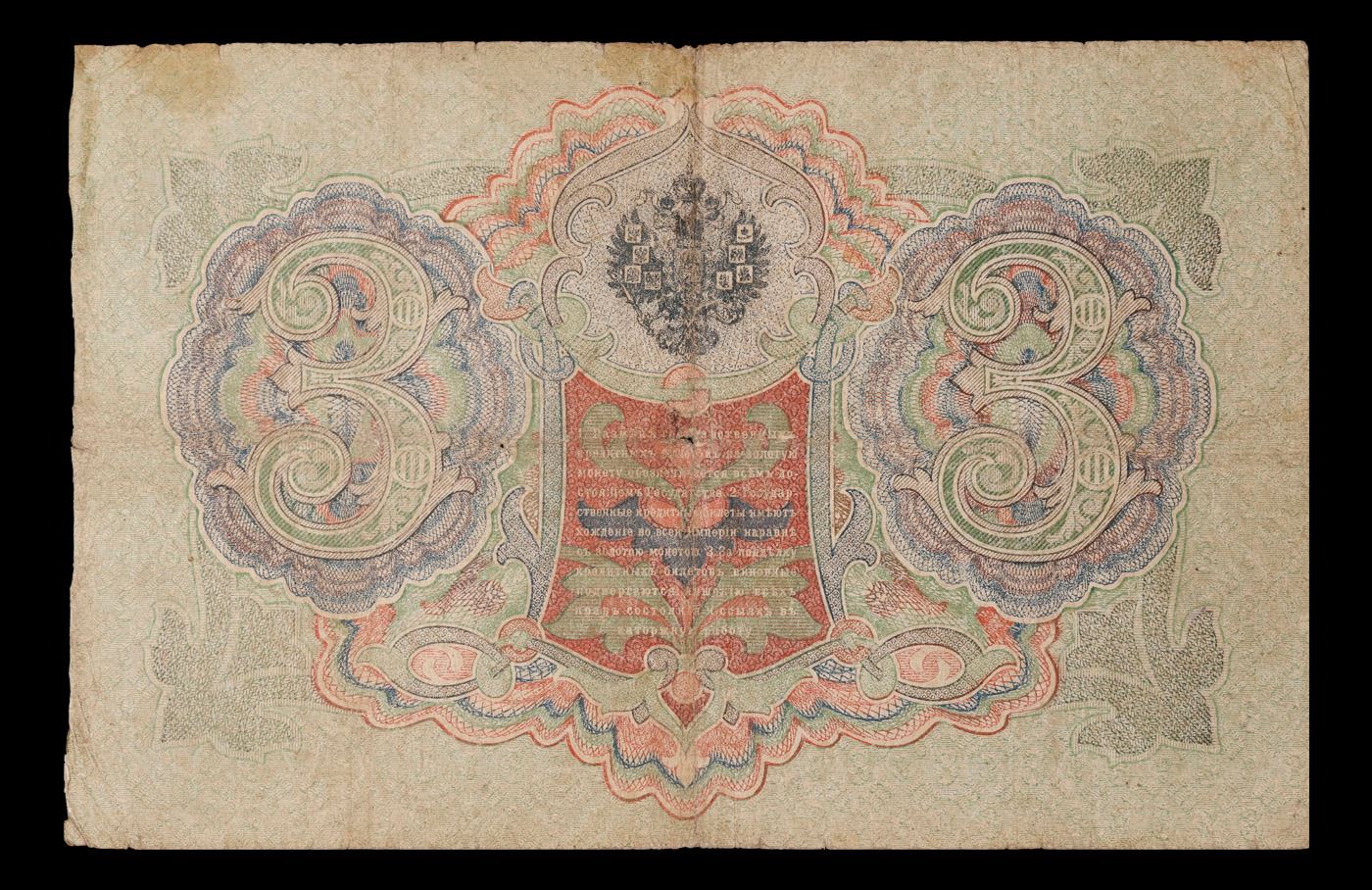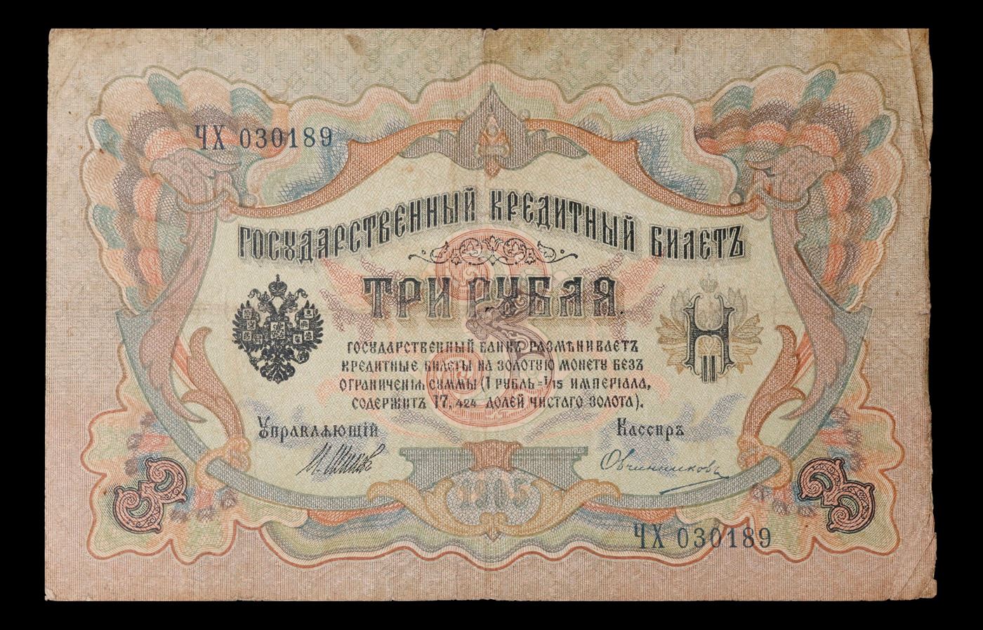 1912-1917 (1905 Issue) Imperial Russia 3 Rubles Banknote P# 9c, Sig. Shipov Grades vf++. Up for auction we have a beautiful, ornate Imperial Ruble note from the final decade of the Russian Empire under Tsar Nicholas II, which managed to survive through the Russian Revolution and Civil War. These notes became relatively useless in the early Soviet period, due to hyperinflation and other factors, and many were lost or destroyed. The 500 Ruble note features a portrait of Peter the Great, and the 100 Ruble note features a portrait of Catherine the Great.