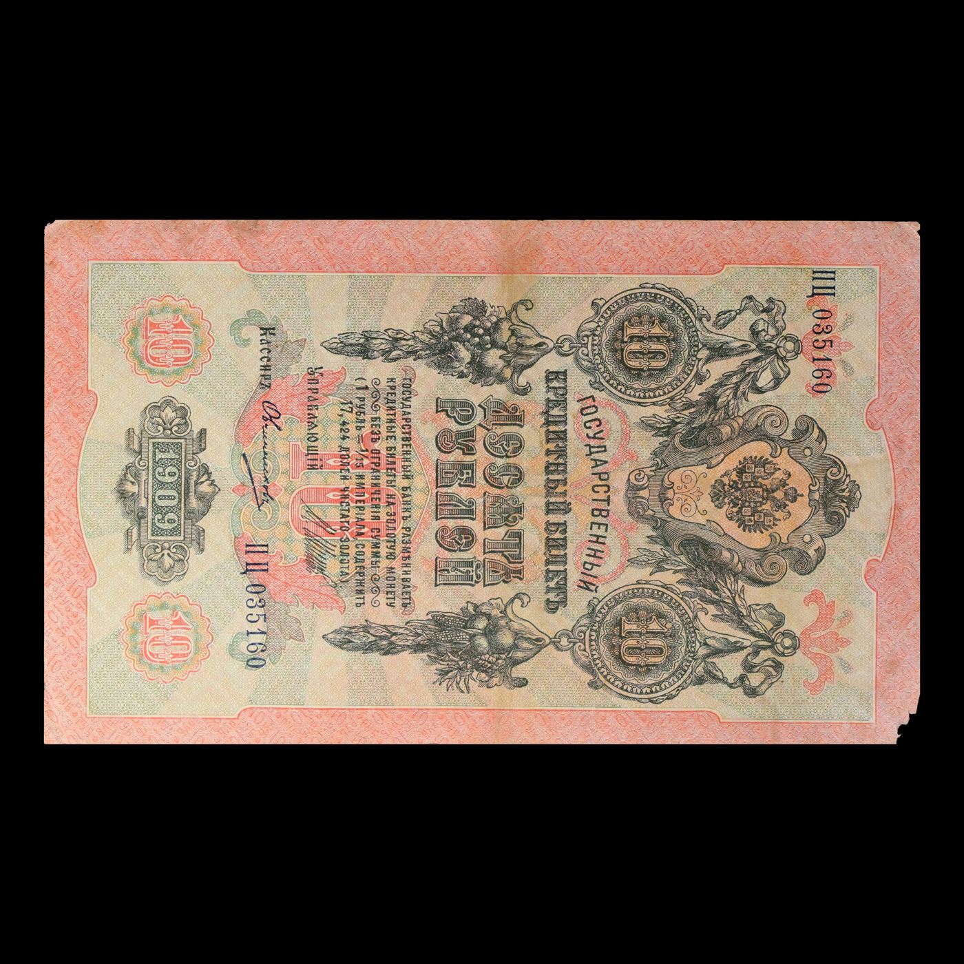 1912-1917 (1909 Issue) Imperial Russia 10 Rubles Banknote P# 11b, Sig. Shipov Grades Choice AU/BU Slider. Up for auction we have a beautiful, ornate Imperial Ruble note from the final decade of the Russian Empire under Tsar Nicholas II, which managed to survive through the Russian Revolution and Civil War. These notes became relatively useless in the early Soviet period, due to hyperinflation and other factors, and many were lost or destroyed. The 500 Ruble note features a portrait of Peter the Great, and the 100 Ruble note features a portrait of Catherine the Great.