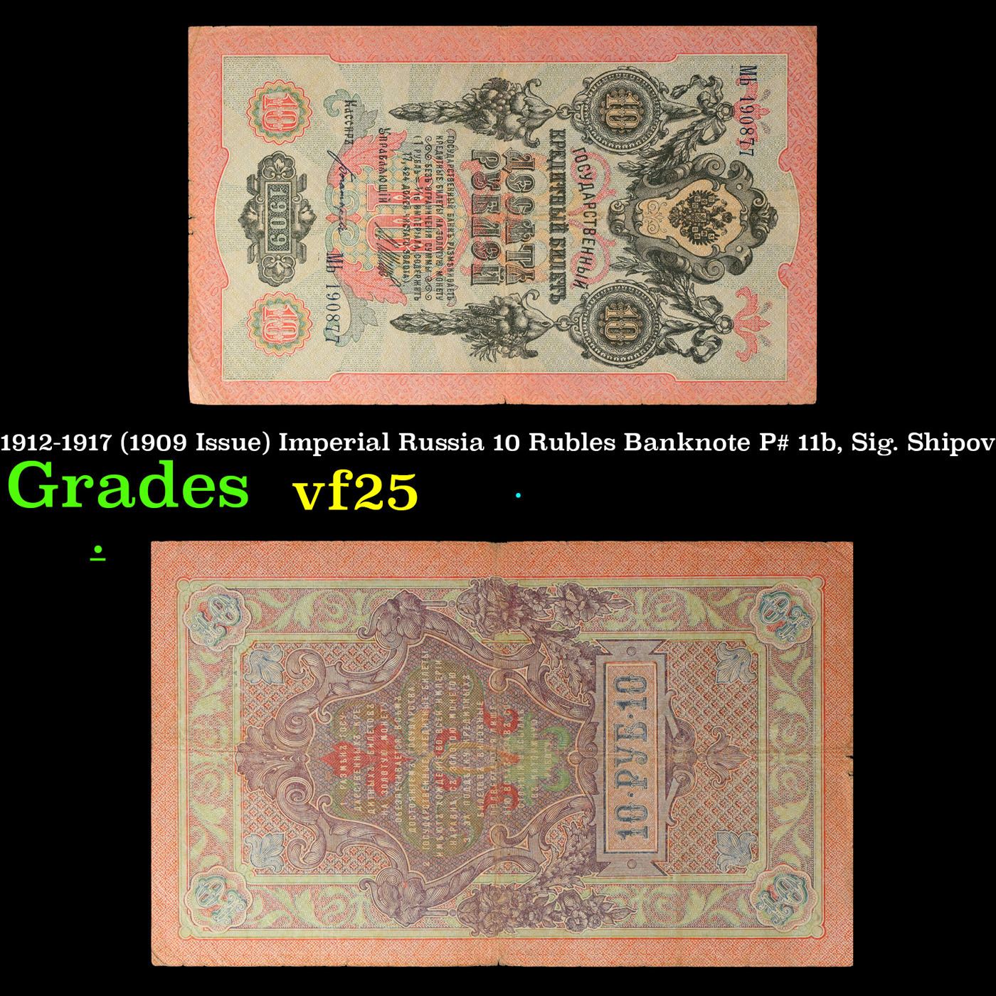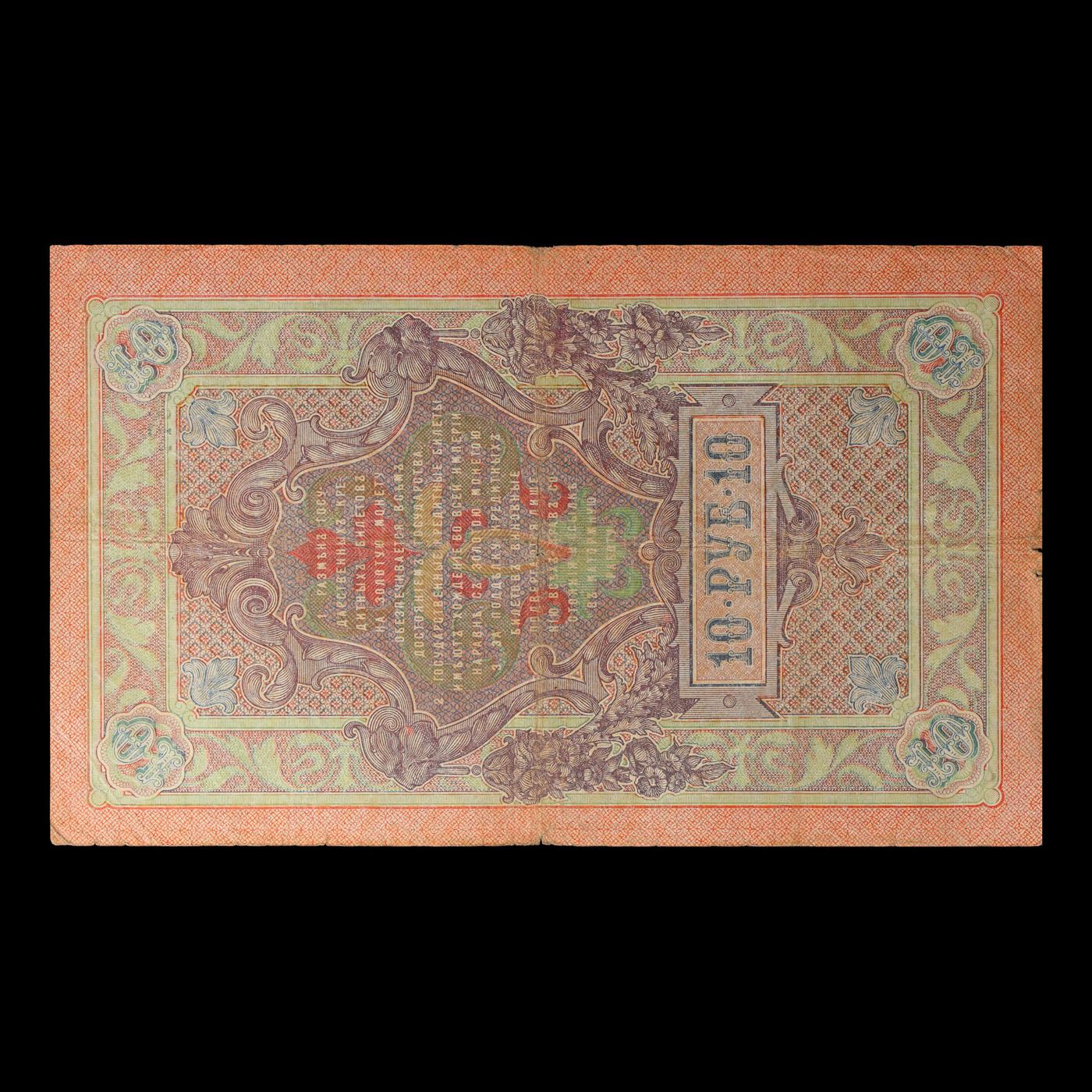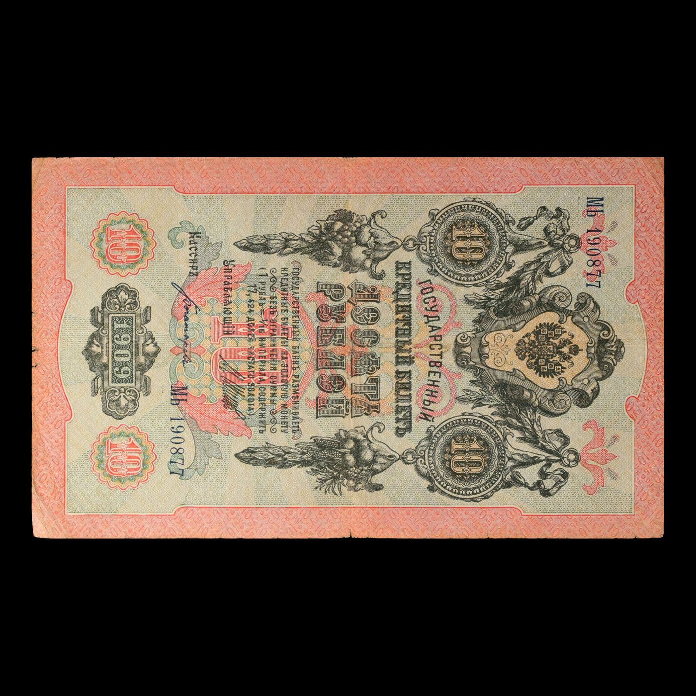 1912-1917 (1909 Issue) Imperial Russia 10 Rubles Banknote P# 11b, Sig. Shipov Grades vf+. Up for auction we have a beautiful, ornate Imperial Ruble note from the final decade of the Russian Empire under Tsar Nicholas II, which managed to survive through the Russian Revolution and Civil War. These notes became relatively useless in the early Soviet period, due to hyperinflation and other factors, and many were lost or destroyed. The 500 Ruble note features a portrait of Peter the Great, and the 100 Ruble note features a portrait of Catherine the Great.