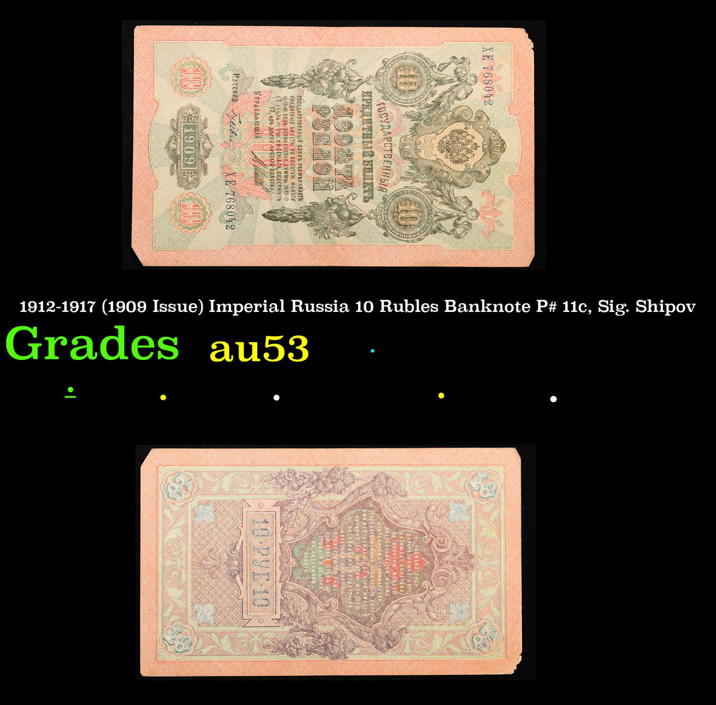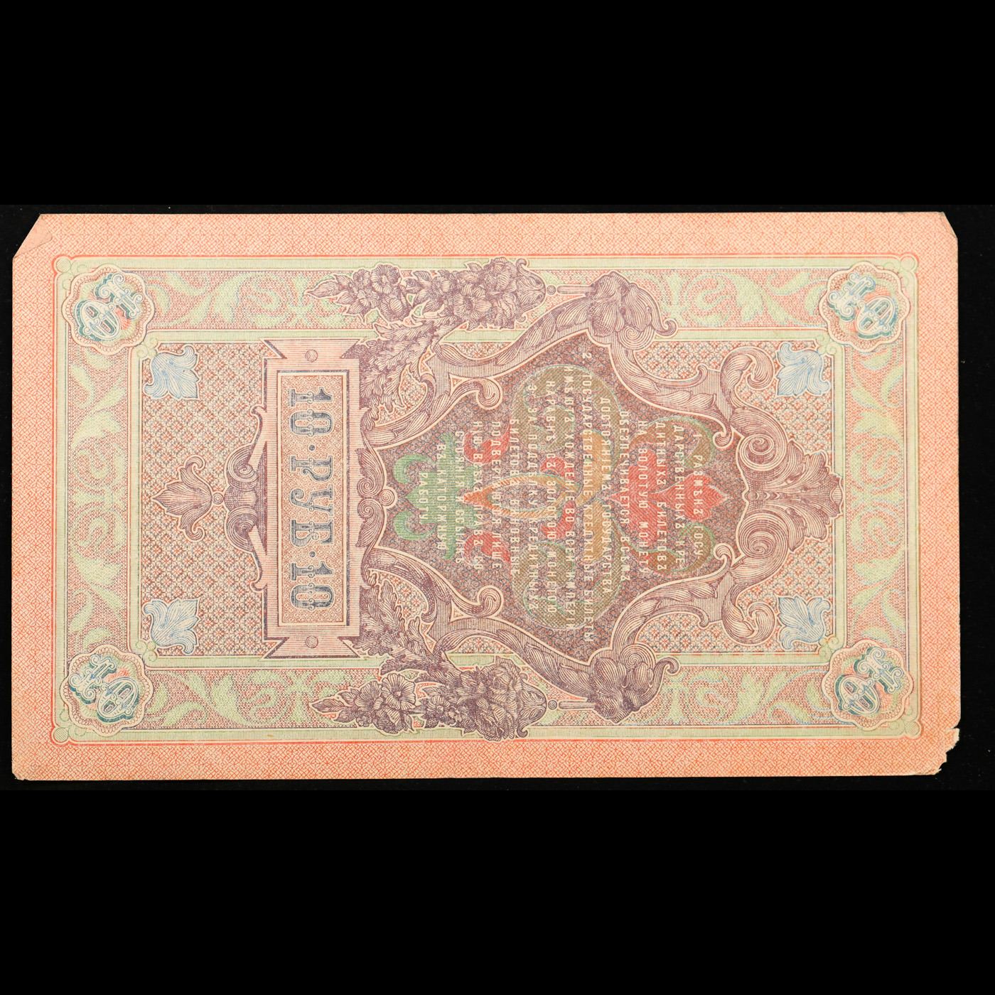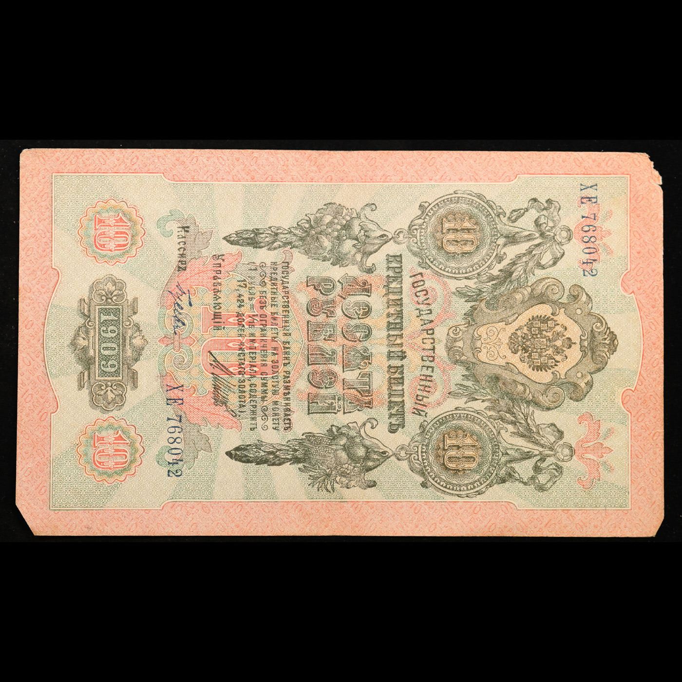 1912-1917 (1909 Issue) Imperial Russia 10 Rubles Banknote P# 11c, Sig. Shipov Grades Select AU. Up for auction we have a beautiful, ornate Imperial Ruble note from the final decade of the Russian Empire under Tsar Nicholas II, which managed to survive through the Russian Revolution and Civil War. These notes became relatively useless in the early Soviet period, due to hyperinflation and other factors, and many were lost or destroyed. The 500 Ruble note features a portrait of Peter the Great, and the 100 Ruble note features a portrait of Catherine the Great.
