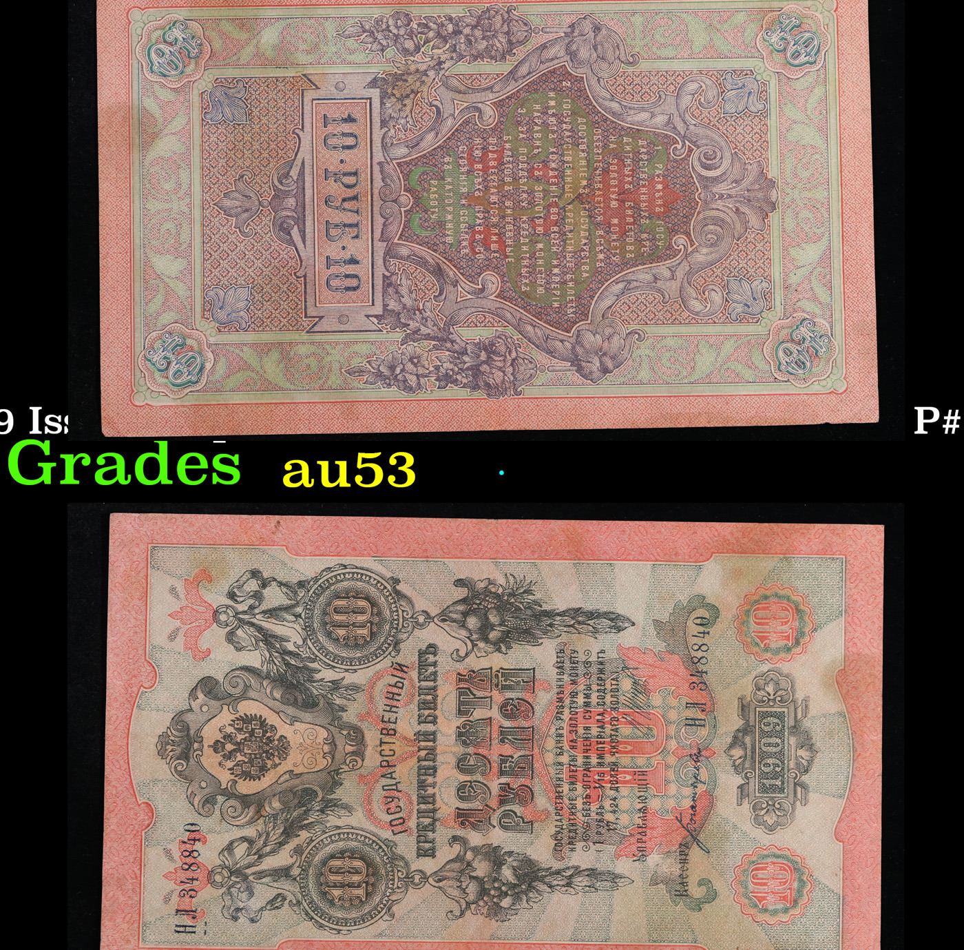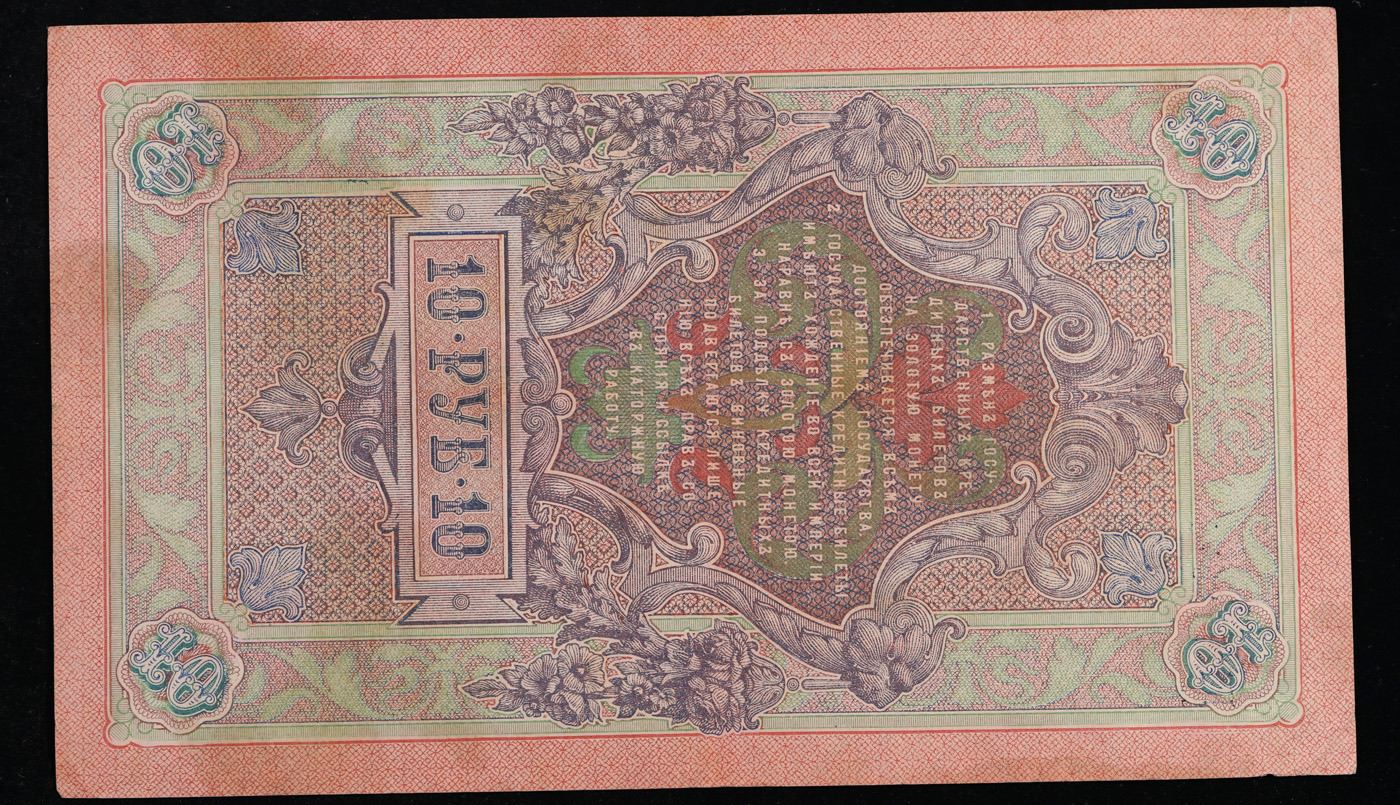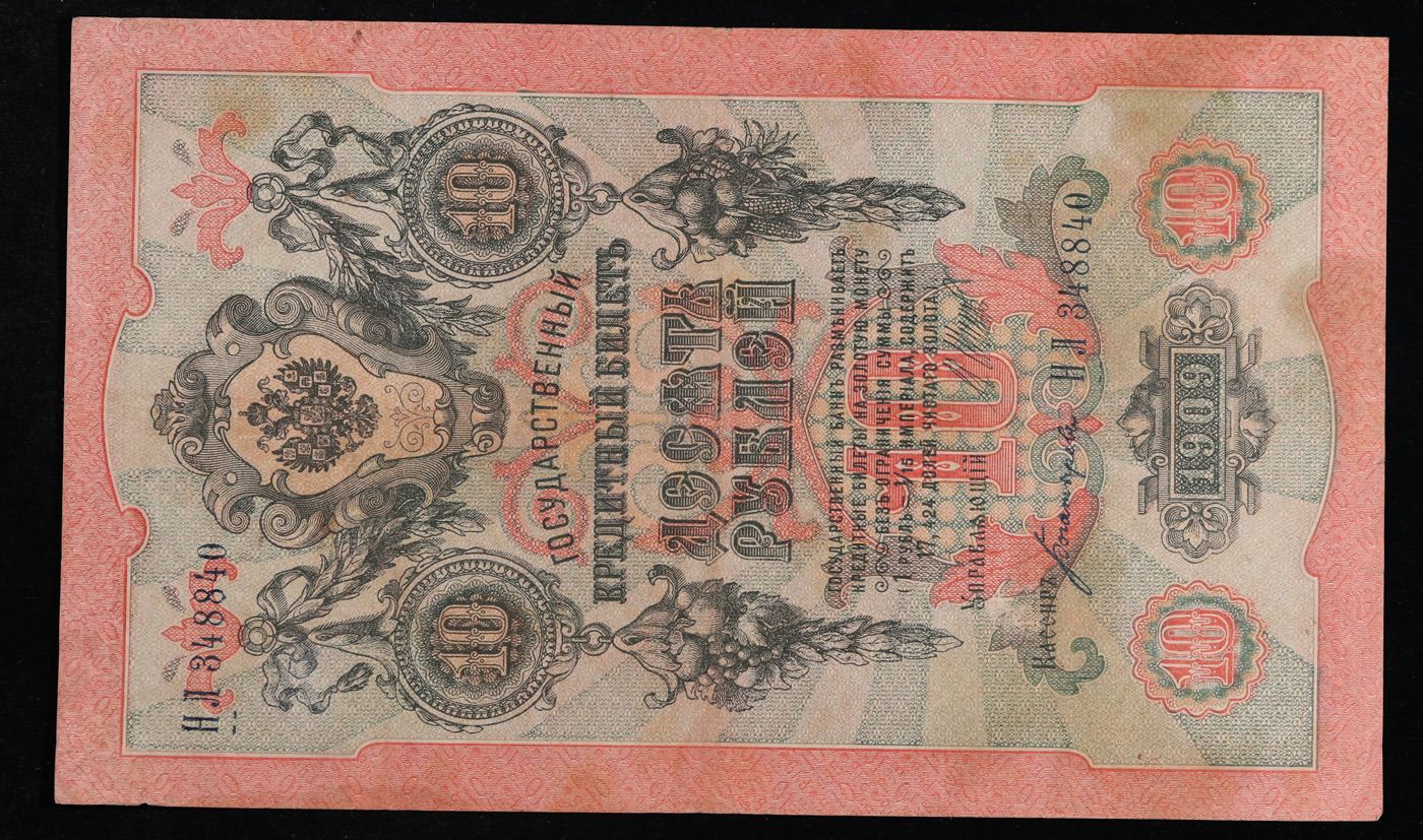 1912-1917 (1909 Issue) Imperial Russia 10 Rubles Banknote P# 11c, Sig. Shipov Grades Select AU. Up for auction we have a beautiful, ornate Imperial Ruble note from the final decade of the Russian Empire under Tsar Nicholas II, which managed to survive through the Russian Revolution and Civil War. These notes became relatively useless in the early Soviet period, due to hyperinflation and other factors, and many were lost or destroyed. The 500 Ruble note features a portrait of Peter the Great, and the 100 Ruble note features a portrait of Catherine the Great.
